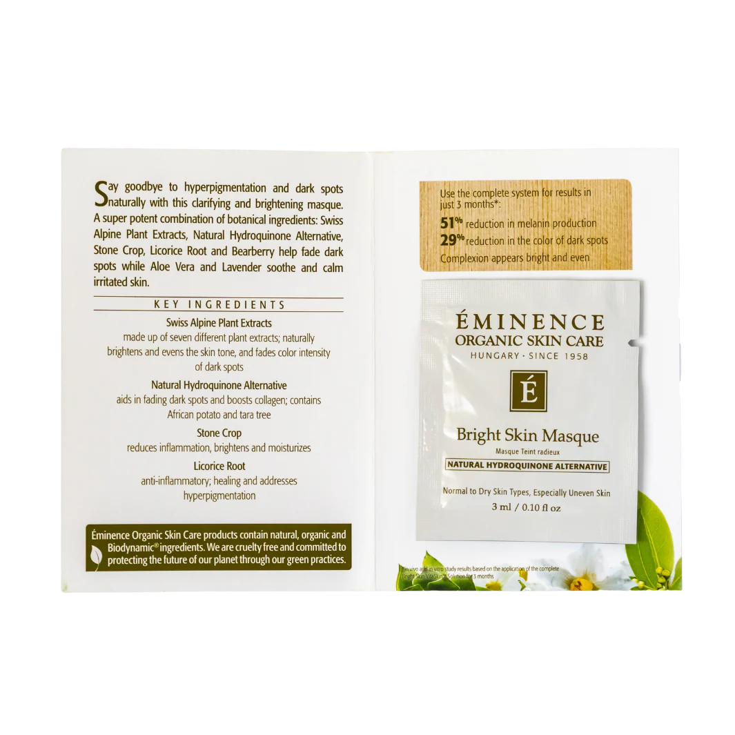 Eminence Organics Bright Skin Masque helps to brighten and hydrate uneven skin pigmentation and to help target dark spots, age spots, and acne scars. Featured ingredients include, Licorice Root, Bearberry Extract, and Stone Crop which all feature brightening properties to help significantly reduce hyperpigmentation.