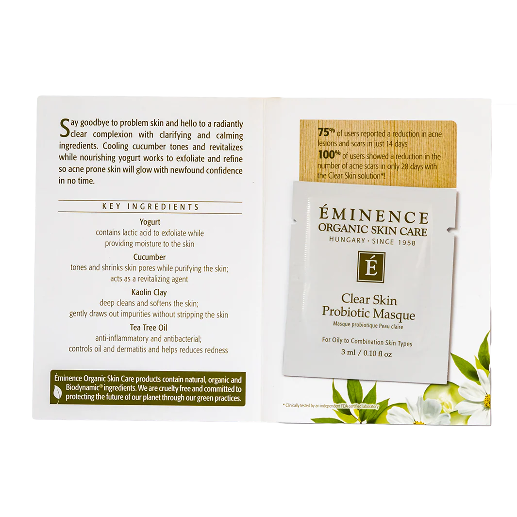 Eminence Organics Clear Skin Probiotic Masque is a clarifying and detoxifying masque that helps remove excess oil, reduce pore size, exfoliate dead skin cells, and provide a clear complexion. Cooling cucumber tones while lactic acid in yogurt helps to exfoliate and eliminates the appearance of blemishes and reduces breakouts. Perfect for oily or combination skin types.