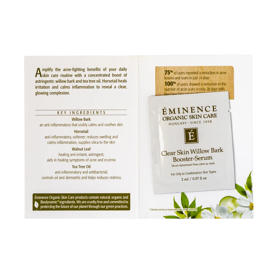 Eminence Organics Clear Skin Willow Bark Booster Serum is an enhanced clarifying serum for oily and acne prone skin types to help reduce redness, breakouts, and pore size. We recommend using the complete Eminence Clear Skin Collection for best results with problem skin.