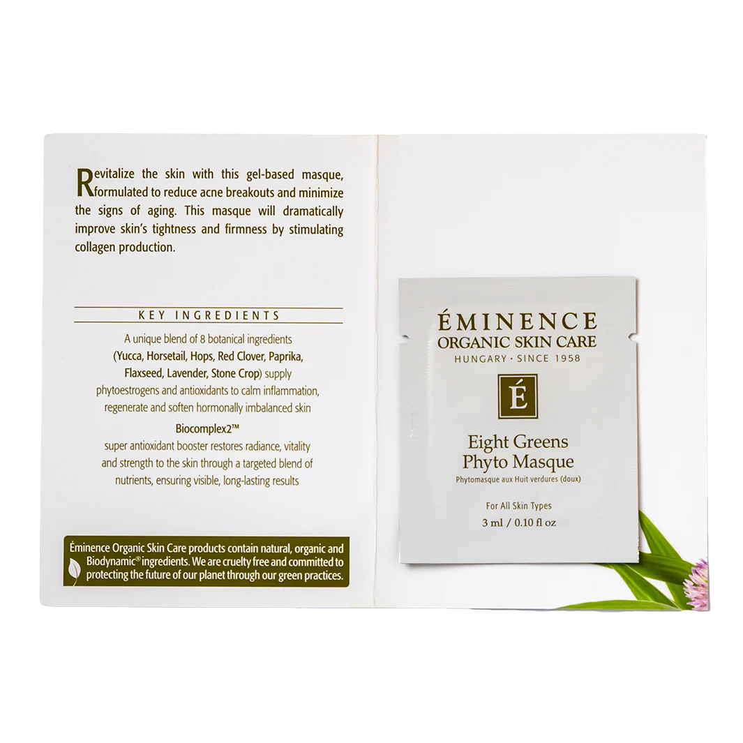 Eminence Organics Eight Greens Phyto Masque (Not Hot) is a phyto-estrogen firming, lifting, hydration and anti-blemish masque for all skin types. This is truly a masque that does it all! Contains whole plants and seeds that are naturally high in phyto estrogens and antioxidant bioflavinoids. Drastically improves hydration and elasticity, reduces the signs of aging, assists in normalizing oil production and helps prevent breakouts. A perfect masque to use before a special event or night out on the town. Helps to erase the signs of aging and returns a healthy, knockout glow.