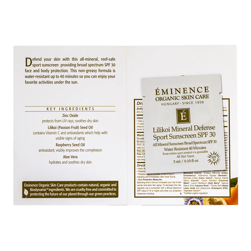 Eminence Lilikoi Mineral Defense Sport Sunscreen SPF 30 is a lightweight and ultra-fast absorbing sunscreen that provides up to 40 minutes of water and sweat resistance for face and body. Provides a clean and non-greasy application that is high in Vitamin C & E and Aloe to help provide environmental protection and reduce any irritation or redness from sun exposure.