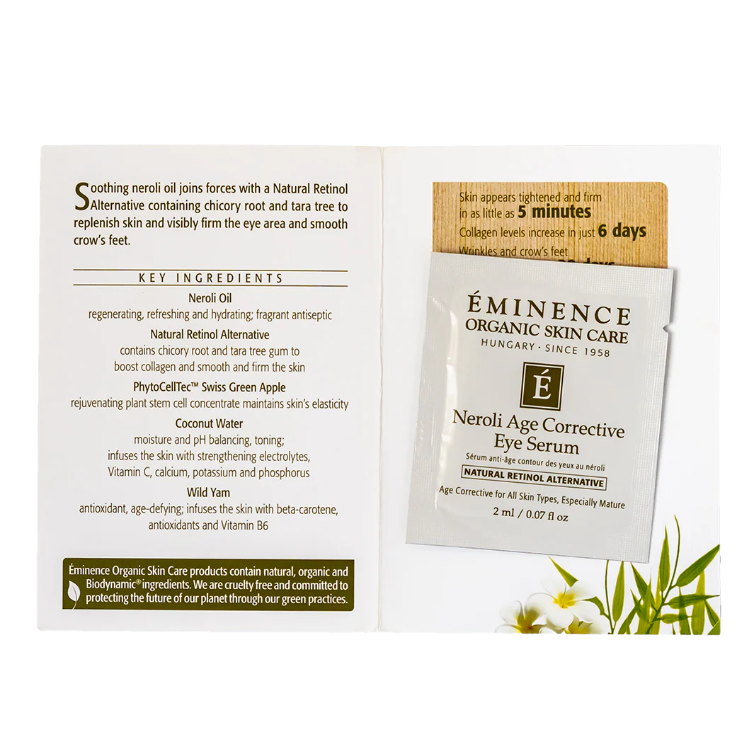 Eminence Organics Neroli Age Corrective Eye Serum targeted collagen boosting and smoothing treatment for the eyes dramatically reduces the appearance of crow's feet, moisturizes and softens the epidermis. Protects and nourishes the delicate skin around the eye and boost collagen production naturally.