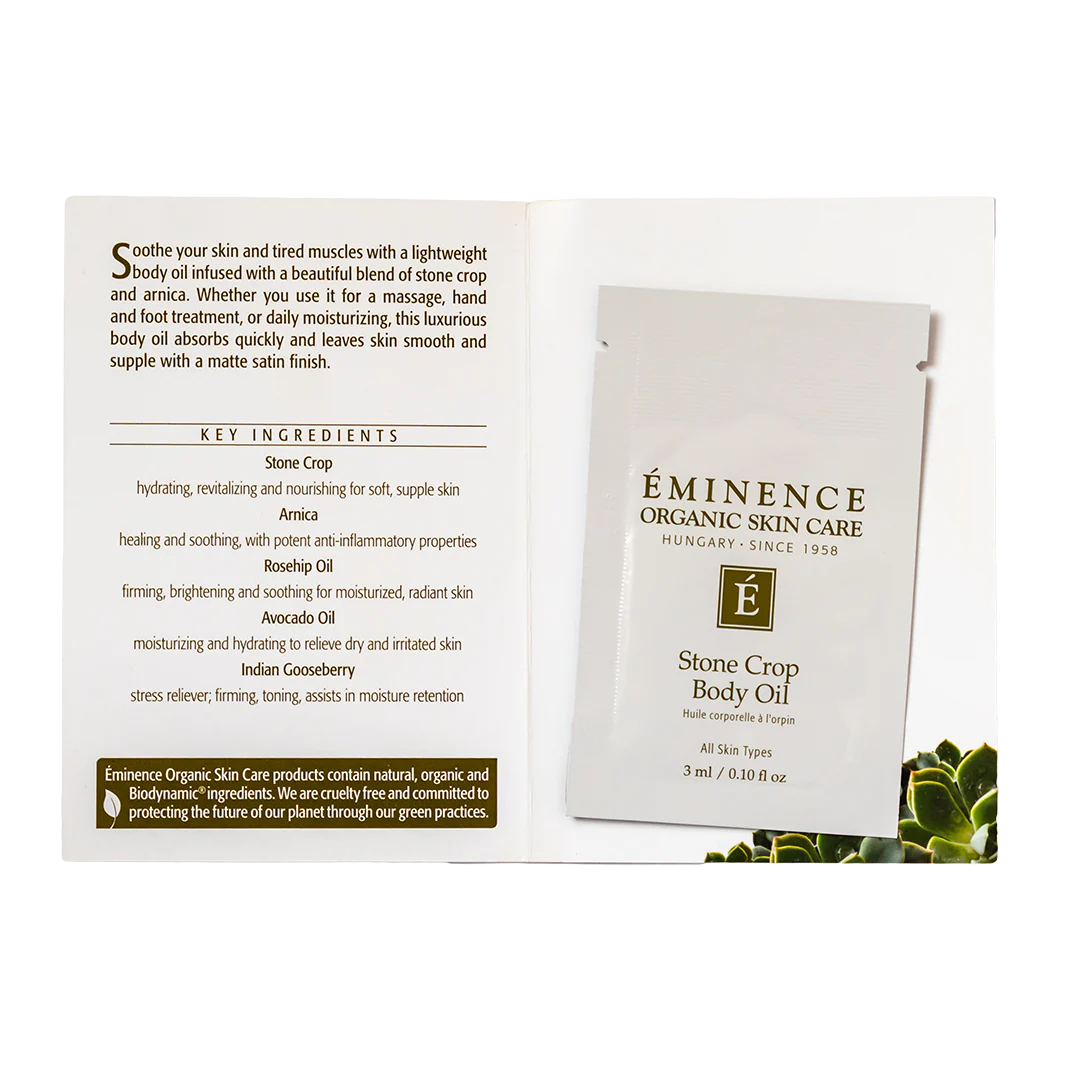 Eminence Organics Stone Crop Body Oil is an ultra soothing body oil that quickly absorbs into the skin leaving a matte satin finish. Features a potent blend of Arnica to help reduce inflammation and ease muscle and joint pain while Stone Crop, Rosehip Oil and Avocado Oil help deeply nourish, brighten, and hydrate the skin. Perfect for all skin types and is ideal for massage, hand and foot treatments, or a daily body moisturizer.